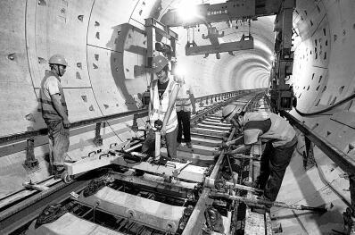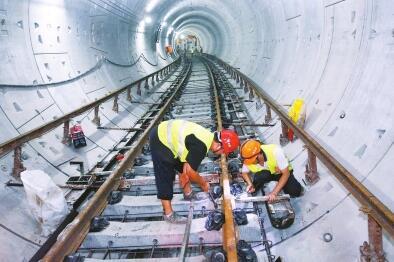 工人們正在鋪軌作業,5號線計劃2019年開通試運行。