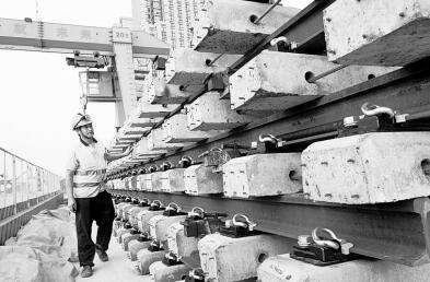 標段總工谷進朝介紹說,每一節鐵軌長度為25米,重量在15噸左右。鐵軌被固定在澆筑的水泥混凝土板塊上,然后通過工程車,運送到相對應的施工段。目前他們做的主要是鋪軌作業,到年底將會把鐵軌焊接到一起,再進行打磨,為下一步的焊軌做準備工作。