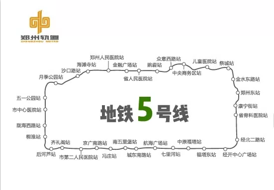 鄭州市軌道交通5號線是鄭州市軌道交通線網中唯一一條環形線路,沿黃河路、黃河東路、商務外環路、龍湖外環路、盛和街、心怡路、經開第十大街、航海路、桐柏路和西站路設置,屬于城市核心區外圍邊緣的環形路線,共有站點32個,全長40.4公里。