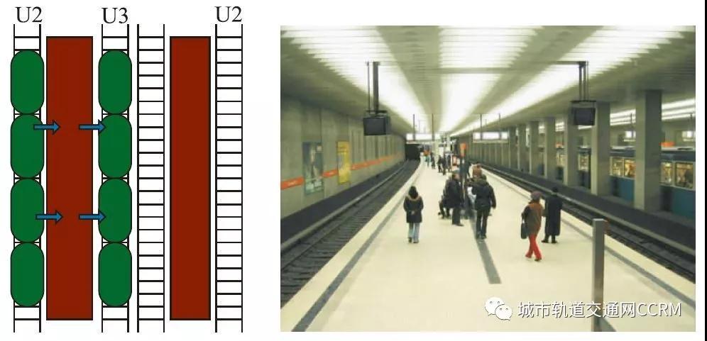在一些地鐵站點,同向的不同線路列車可以實現無縫換乘。如分子廣場站(Scheidplatz),U2和U3兩條線路的列車在相鄰的軌道上平行停放,根據時刻表的合理安排,乘客可利用上下車時間,進行無縫換乘。