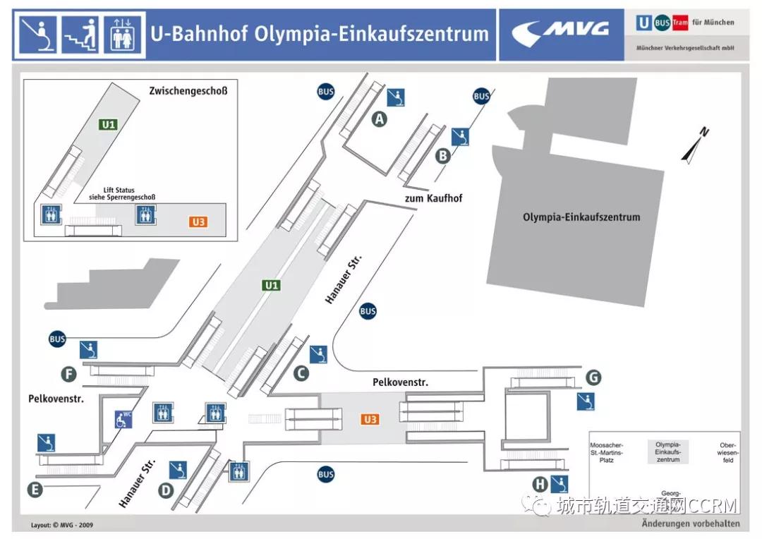1)地鐵換乘樞紐站。比較典型的是奧林匹亞購物中心車站(0lympia Einkaufszentrum)。該站是一個擁有3層空間的換乘樞紐,其銜接了地鐵U1和U3,共擁有8個出口,地下1層是公共服務區;地下2層是地鐵U1的站臺,為側式站臺;地下3層則是U3的站臺,為島式站臺。U1與U3的站臺之間都有電梯或直接將其連接,從而方便乘客的換乘。