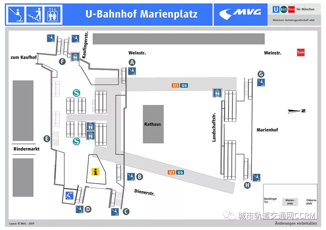 2)綜合換乘樞紐。比較典型的是瑪利亞廣場站(Marienplatz),該站是連接地鐵(Ubahn),城鐵(Sbahn)的綜合換乘樞紐,其銜接8條城鐵線路,4條地鐵線路。該站分為4層,地下1層為地鐵服務中心,地下2層是慕尼黑中央車站方向的城鐵線路,地下3層是慕尼黑東車站方向的城鐵線路,地下4層則是地鐵線路。相互層之間都有自動扶梯,而且有從地下1層直接到地下4層的自動扶梯,換乘十分便利。