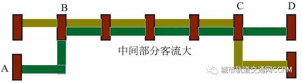 共軌運營是為了應對線路中間部分客流大,而線路兩邊臨近終點站的客流少的一種運營組織模式。如圖所示,B、C站客流量較大,而終點站D的客流量較小,所以采用共軌運營模式,以緩解中間客流大的壓力,典型的有U4、U5;U3、U6等。共軌運營使得列車間隔變小,可有效緩解客流壓力。